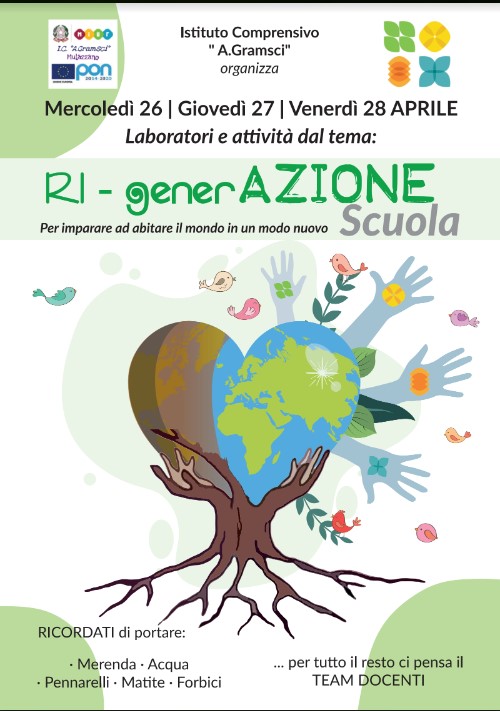 L'ISTITUTO COMPRENSIVO "A. GRAMSCI" organizza laboratori e attività a tema RI-generAZIONE nei giorni 26, 27 e 28 aprile 2023.