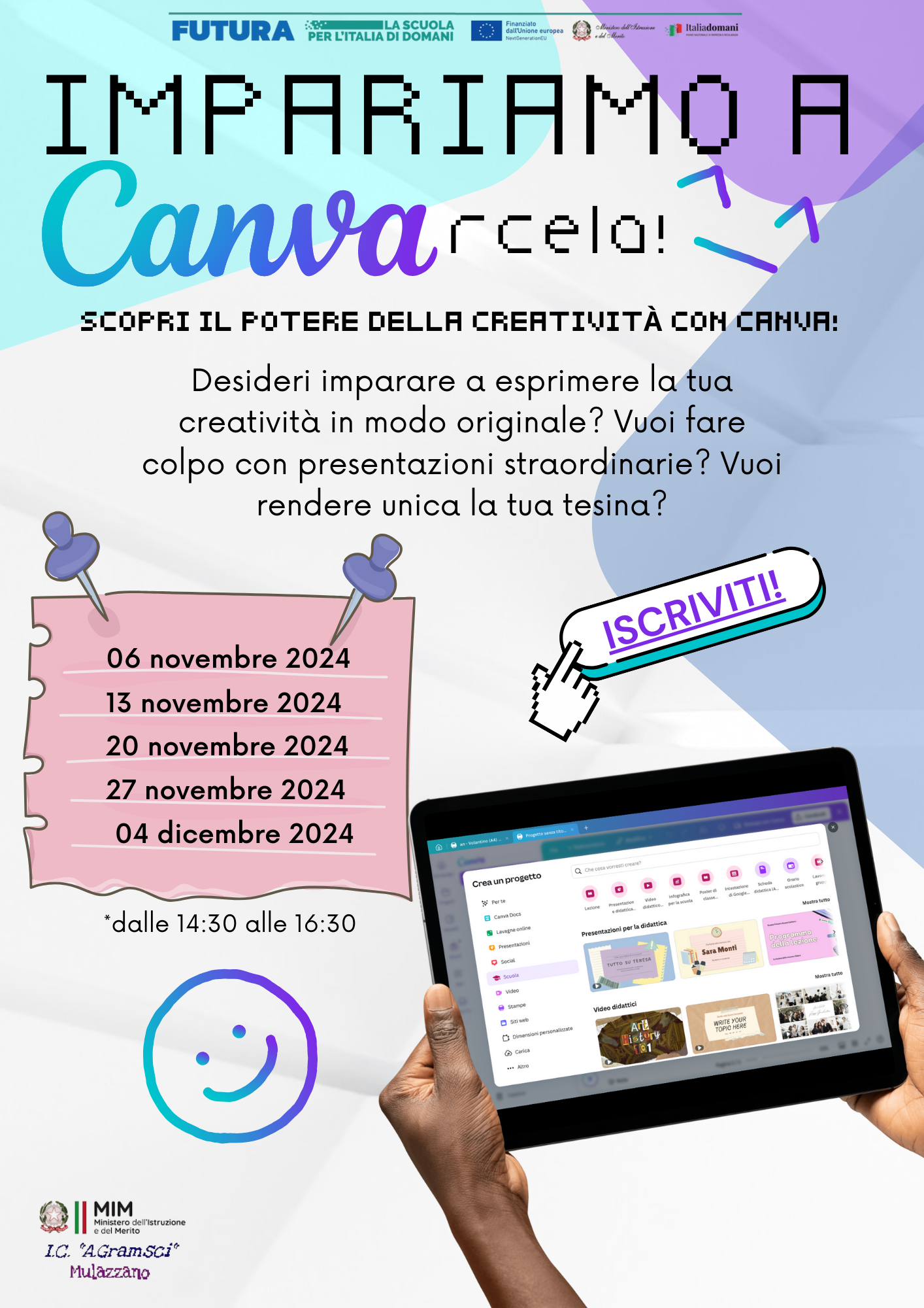 Il nostro Istituto propone il laboratorio pomeridiano "CANVArcela" per le classi terze della scuola secondaria, finanziato con i fondi PNRR DM. 65/2023 e gratuito per gli alunni, dove potranno apprendere o migliorare l'uso dell'applicativo CANVA.