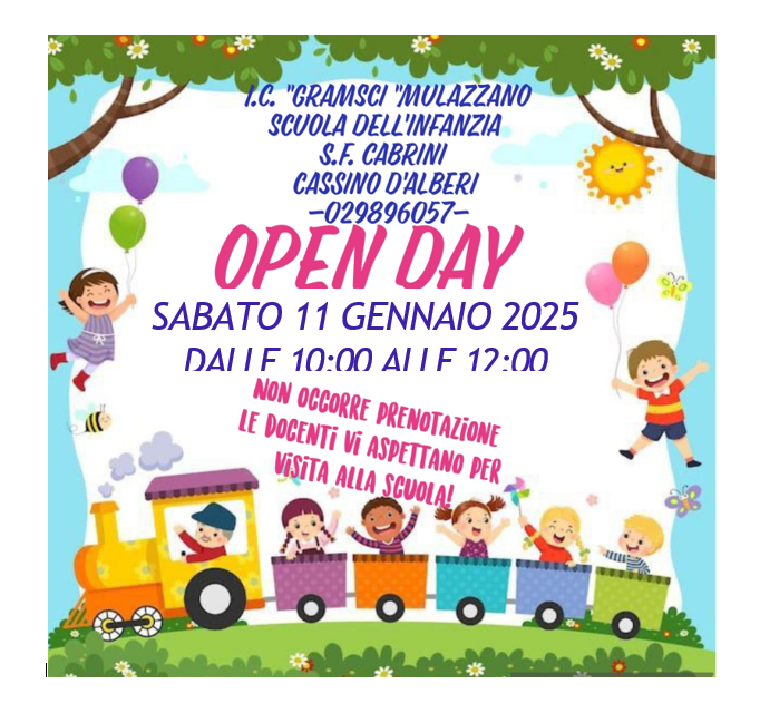 Circolari e comunicazioni Genitori Stampa Condividi Facebook Twitter Whatsapp Telegram Email OPEN DAY - SCUOLA INFANZIA 11 gennaio 2025 GenitoriDocenti SABATO 11 GENNAIO 2025 DALLE 10 ALLE 12